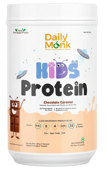Daily Monk™ Kids Protein blends Pea, Pumpkin Seed, and Brown Rice Protein for complete nutrition, plus a Complex Carb Blend for energy and digestion. Fortified with 50%+ RDA vitamins and minerals, Superfoods, and DHA, it supports strong bones, immunity, and brain health—all in a smooth, naturally sweetened, easy-to-digest formula.​